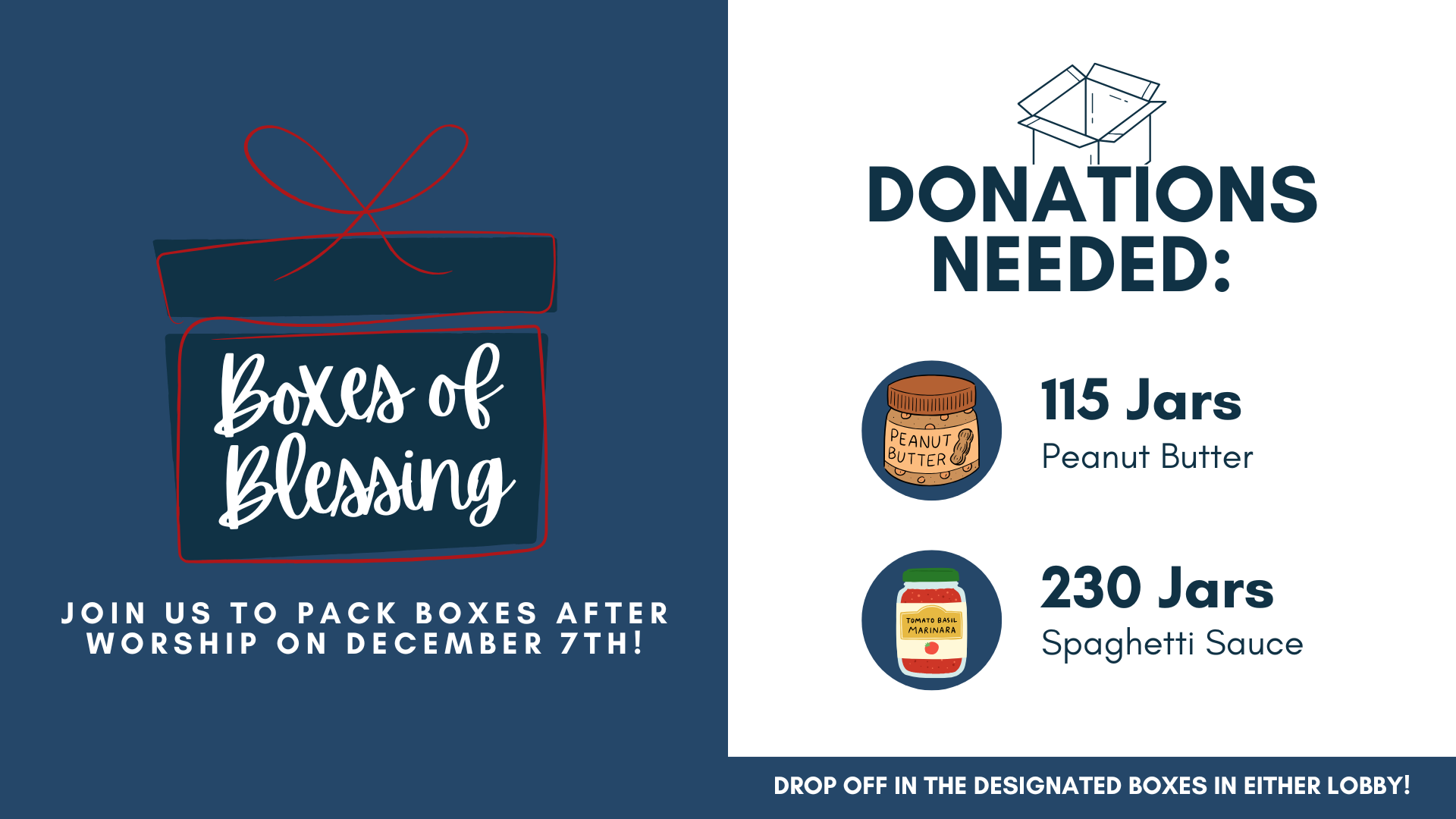 Stick around after the service to help pack Boxes of Blessing for families in our community. This is a great way to serve together and share Christ’s love in a tangible way.
