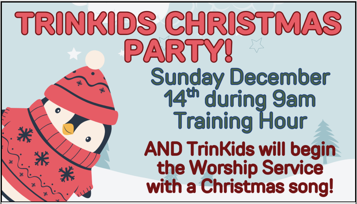 Kids will enjoy the Christmas story, crafts, and fun games as we celebrate the birth of Jesus together. All children are welcome during the regular TrinKids hour.